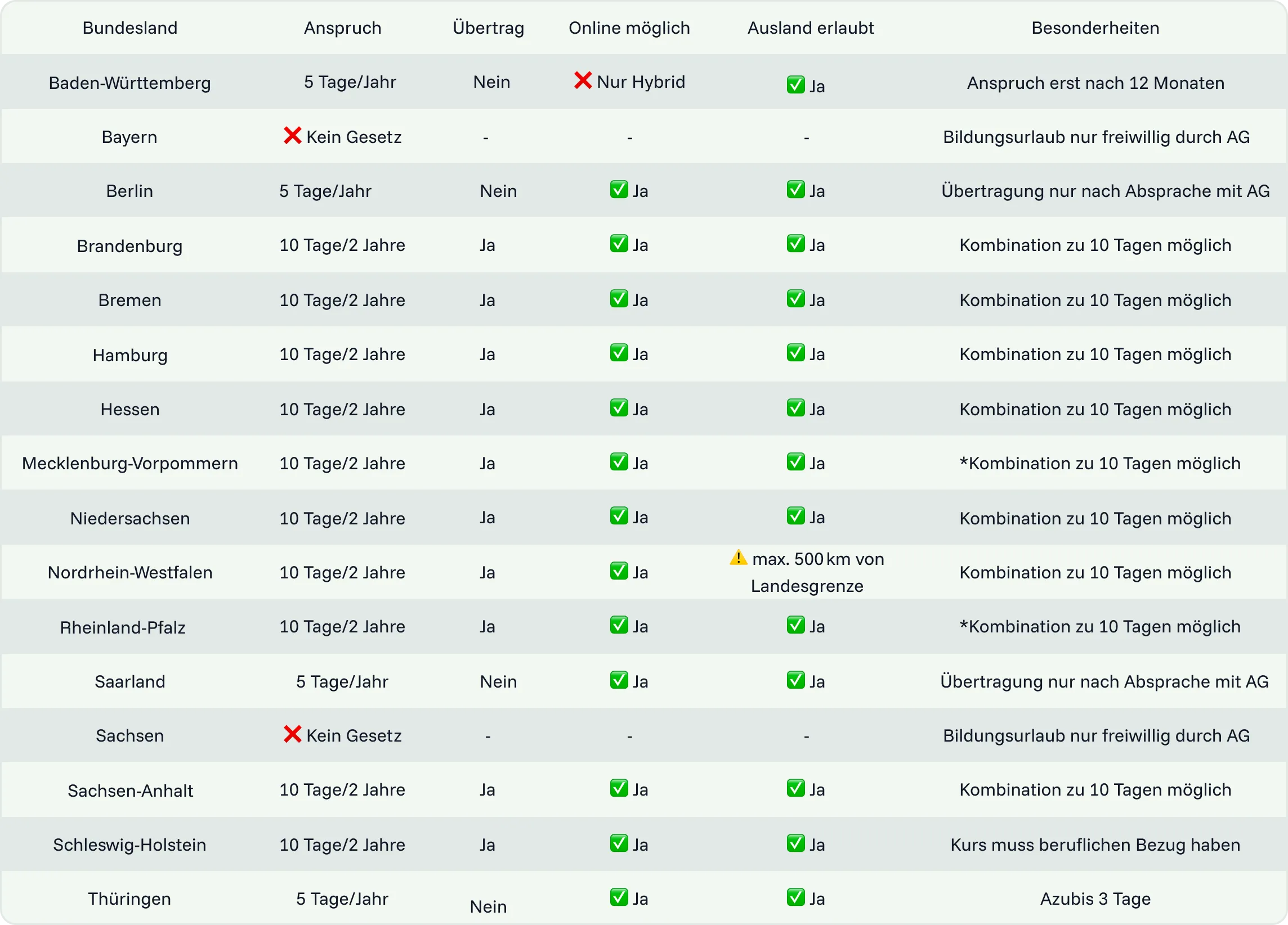 In fast allen Bundesländern hast du als Arbeitnehmer*in nach nur 6 Monaten Betriebszugehörigkeit einen gesetzlichen Anspruch auf Bildungsurlaub/zeit – meist 5 Tage pro Jahr. In einigen Ländern kannst du sogar 10 Tage am Stück nehmen – wenn du zwei Jahre kombinierst. Hier siehst du auf einen Blick, wie die Regelungen in deinem Bundesland aussehen: